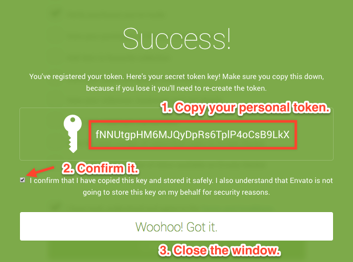 Please copy your personal token, then confirm the storage by clicking on the checkbox and press the “Woohoo! Got it.” button.